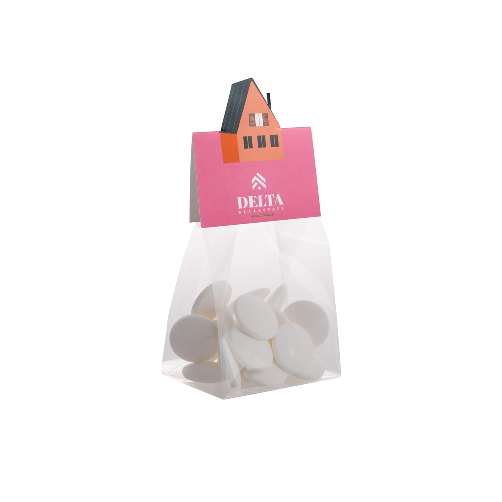 Transparant blokzakje met full colour bedrukt kopkaartje in eigen vorm, gevuld met ca. 50 gram Imperiales