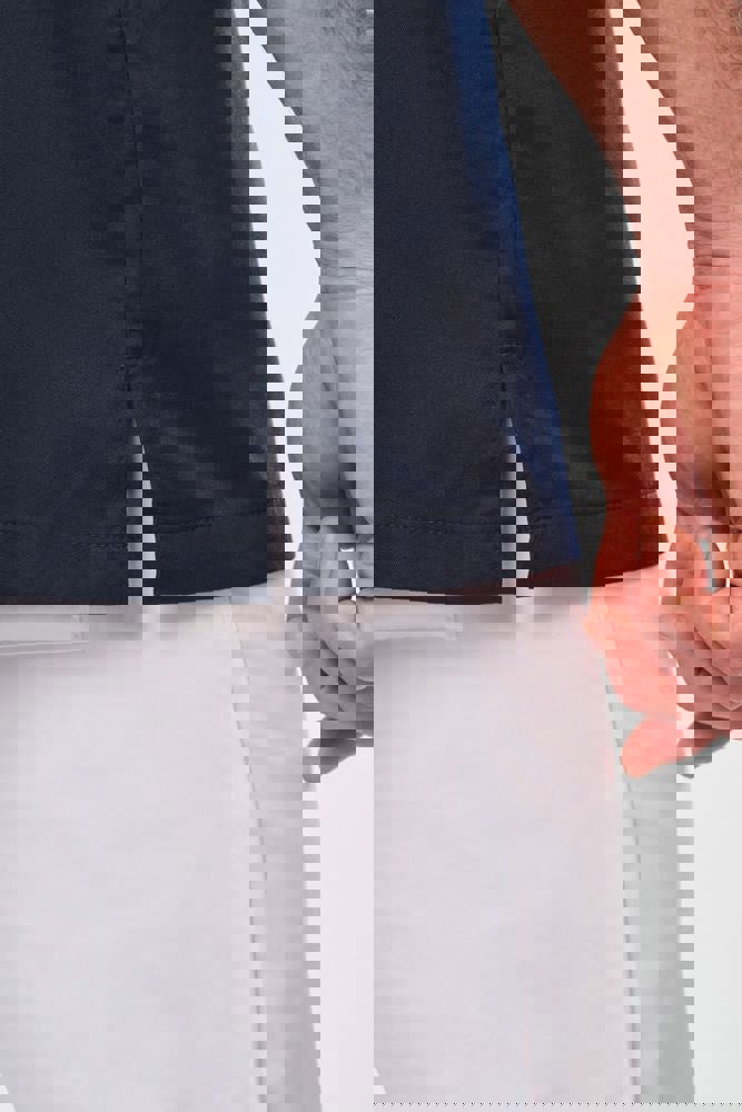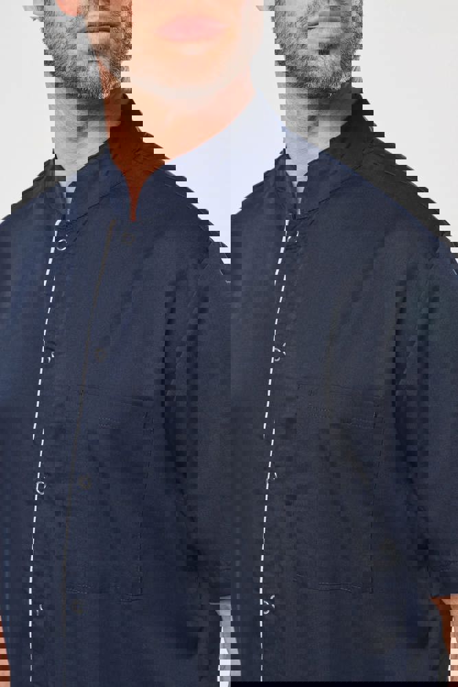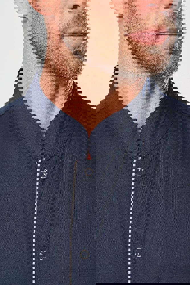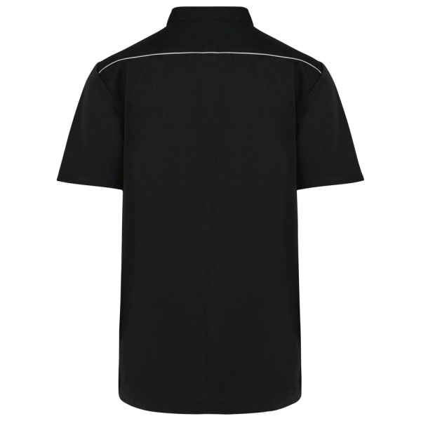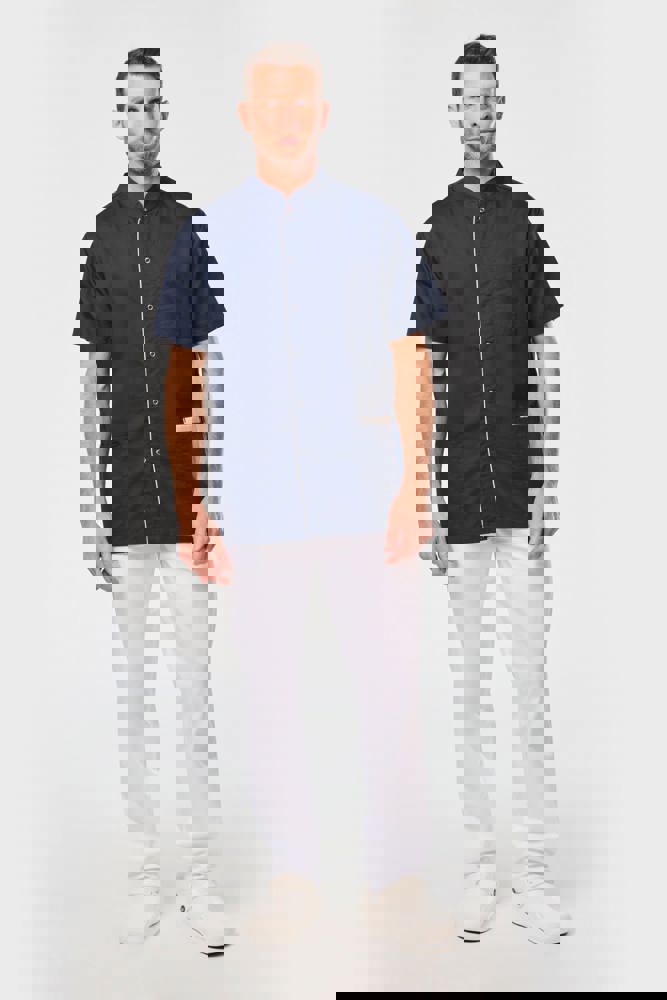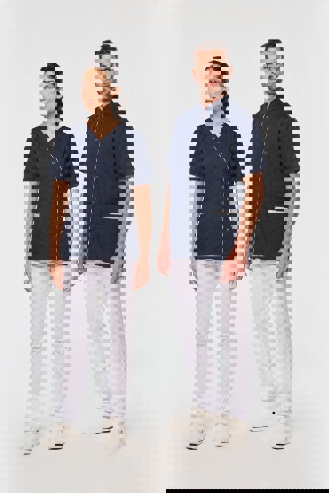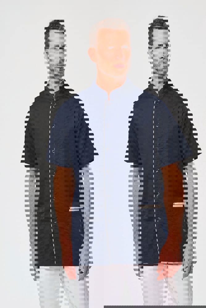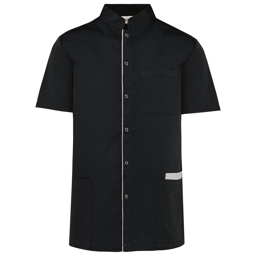 65% polyester / 35% katoen. Polykatoenen twill. Wassen op 60°C. Rechte snit. Maokraag. Sluit vooraan met drukknopen. 1 opgezette borstzak met pennenvakje links. 2 grote opgezette zakken vooraan, waarvan één (links) met twee vakjes (binnenzak met contrasterende boord). Contrasterende bies op de sluiting en op het inzetsel achteraan. Naamlabel aan de binnenkant. 2 zijsplitten. Tear-away merklabel.