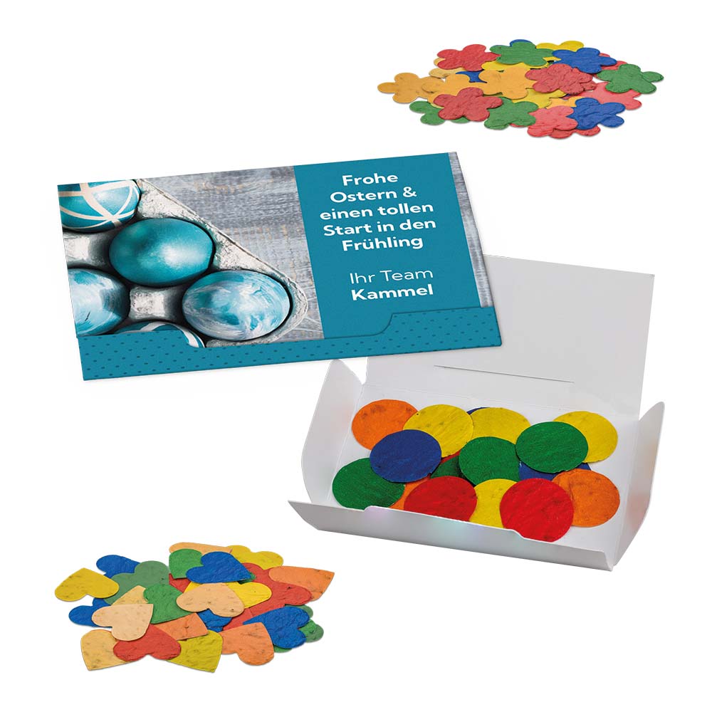 Er is altijd wel iets te vieren! Onze confetti van zaadpapier zorgt niet alleen voor een feestelijke sfeer, maar stimuleert ook de groei van prachtige bloemen. De zaadjes van een kleurrijke bloemenmix zitten al in het biologisch afbreekbare papier. Dit milieuvriendelijke relatiegeschenk is ideaal voor jubilea, feesten, evenementen en elke gelegenheid waarbij vrolijkheid en duurzaamheid hand in hand gaan. De 20 stukjes zaadpapier zijn verkrijgbaar in een ronde, hart- of bloemvorm (elk met één zaadsoort) en in een mix van rood, groen, blauw, oranje en geel. Regen of water lost het papier snel op en de zaadjes beginnen te ontkiemen. Verpakt in een handig creditcardformaat dat gepersonaliseerd kan worden, is het een charmante giveaway met een duurzame boodschap.