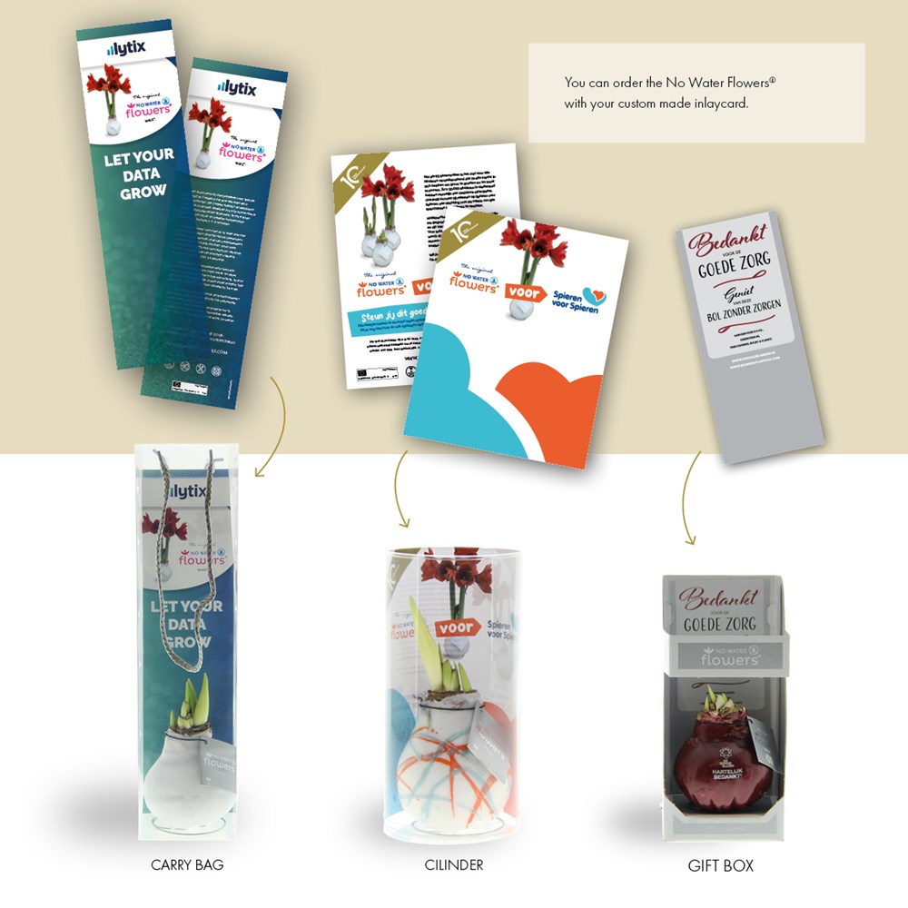 Dit prachtige geschenk zal niet onopgemerkt in een kast belanden. Hoewel sommige varianten niet geschikt zijn voor personalisatie op de bol zelf, bieden ze wél mogelijkheden voor een persoonlijke boodschap via een gepersonaliseerde achterkaart in de geschenkverpakking of een los kaartje. Zo kun je toch jouw boodschap, logo of slogan toevoegen aan de verpakking. Het geven van deze gepersonaliseerde No Water Flowers® versterkt het gevoel van verbondenheid en waardering, perfect als stijlvol geschenk voor personeel of relaties. De No Water Flowers® zijn een uniek groeiend en bloeiend geschenk, perfect om te geven en te ontvangen.