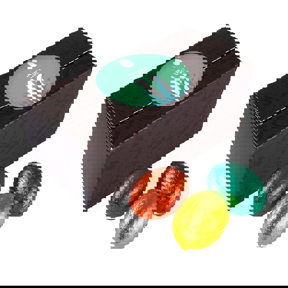 Standaard bedrukt ballotin doosje voorzien van een full colour sticker op het deksel en gevuld met ca. 150 gram Crispy Paaseitjes